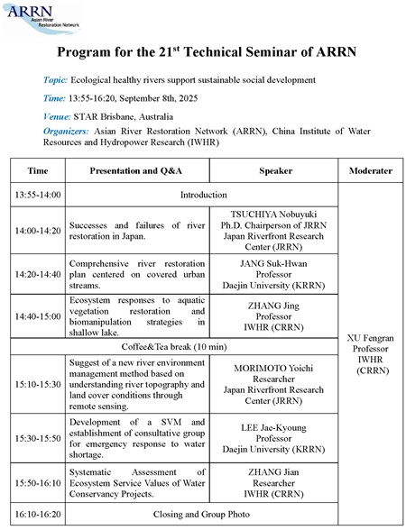 2025年9月8日(月)、ARRN主催『第21回ARRN水辺・流域再生にかかわる国際フォーラム』を第26回国際河川シンポジウム(26th International Riversymposium)の分科会としてオーストラリアのブリスベン市にて開催しました。