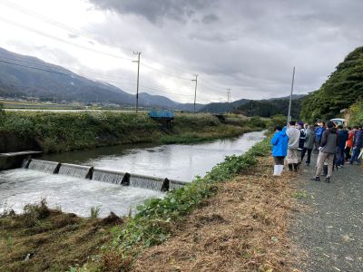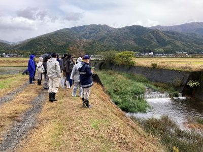 はす川の落合堰及び支川・串小川に設置されている落差工等を視察し、生き物の視点から自然環境や課題等を学びました。 ※雨天のため2班に分けて視察
